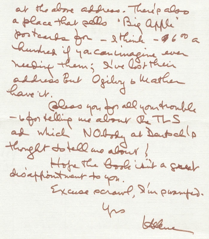 كانت الكاتبة الأمريكية ( هيلين) فقيرة نوعاً ما ومن الصعب أن تحصل على كتب أثرية لاعتقادها أنها باهظة الثمن ومن الصعب الحصول على الكثير من الكتب في نيويورك وقتها، لذلك قامت بمراسلة المكتبة لطلب نسخ مستعلمة ورخيصة من قائمة الكتب التي ترغب بها دون أن يتعدى سعر الكتاب عن ٥ دولارات.
